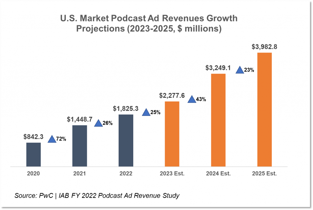 Looking ahead, the IAB is projecting a 25% increase in 2023 and for podcasting to surpass $2 Billion in annual ad revenue. By the end of 2025, the IAB expects ad revenue to reach $3.98 Billion, more than double what it was in 2022.
