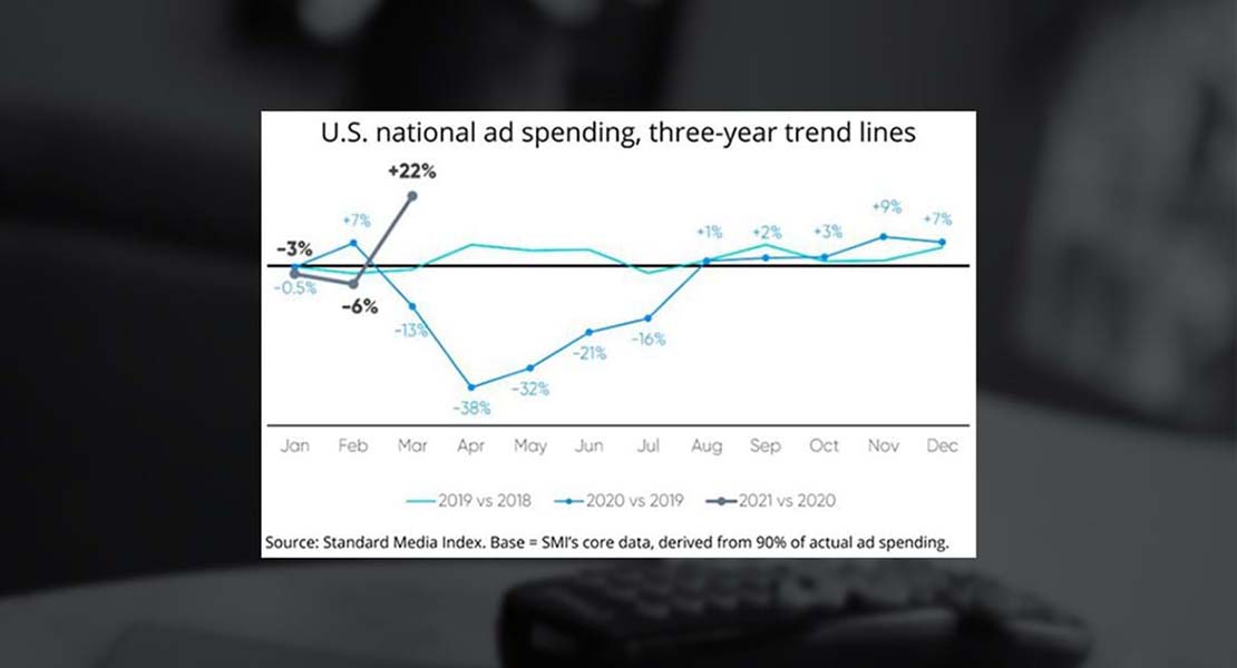 National ad spending expanded 22% in March 2021 vs. a 13% contraction in March 2020. Data from Standard Media Index’s core database, which represents 90% of U.S. national spending indicates that the “U.S. ad industry is back on firm footing, and then some.” TV ad spending, which shows demand for TV ad inventory has also rebounded, with a 13% gain. SMI’s update also indicates U.S. digital ad spending expanded 27% in March vs. the same month last year. (MediaPost: 4/16/21)