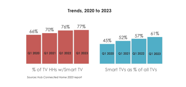 A study conducted by Hub Entertainment Research found that smart TVs have reached a new milestone, topping an estimated 204 million smart TV sets in American homes. The study found that almost 8 in 10 TV households own a smart TV, up from 66% in 2020. Additionally, more people are using their smart TVs to stream as “almost nine in ten (88%) smart TV homes regularly stream shows through their smart TV’s built-in capability.” (TVTechnology: 4/10/23)