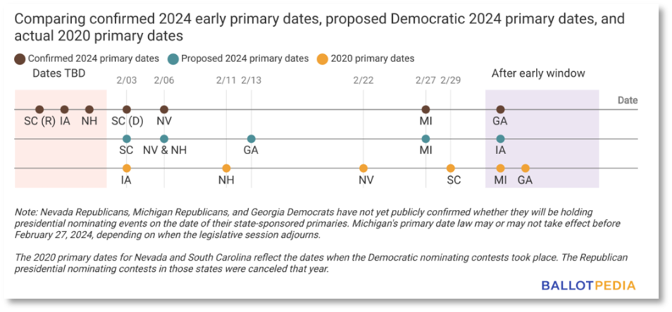 With the 2024 November election just a year and a half away, the calendar for the presidential primaries is beginning to take shape. Ballotpedia provides detail on “the six states where some of the early contests might take place: Iowa, South Carolina, New Hampshire, Nevada, Georgia, and Michigan.” (BallotpediaNews: 5/15/23)