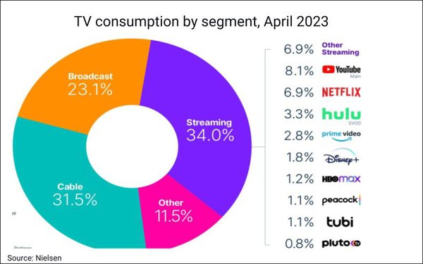 According to Nielsen’s monthly tracking of broadcast, cable, and streaming consumption on TVs, streaming was down 2.1% in April 2023 when compared to March 2023. However, streaming is still the largest share of total hours spent watching TV. Among streamers, FASTs with increased usage included Tubi at 1.1% (up 6% from March) and Pluto TV at 0.8% (up 3.9% from March). “Time spent watching YouTube on television (excluding YouTube TV) rose 1.5% in April, driving a 0.3-point gain in share and maintaining YouTube’s status as the most-watched streaming platform, with an 8.1% share of overall TV viewing.” Netflix was down 7% and lost 0.4 points in share for a 6.9% share of total TV. Disney+ was also down 1.7% in usage but retained its 1.8% share. (MediaPost: 5/16/23)