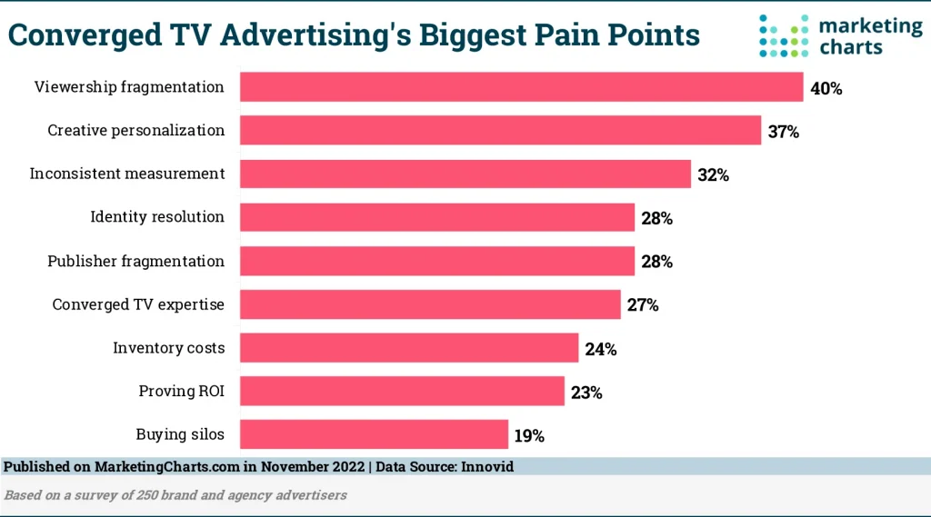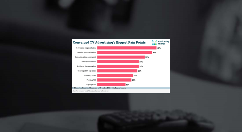 As the converged TV market is on the “upswing” it’s also facing some challenges. According to Innovid. “the biggest of those is viewership fragmentation … as advertisers contend with audiences spread out across the different publishers, devices, and platforms.” Other top challenges include creative personalization and inconsistent measurement. “There’s broad consensus among the survey’s respondents that a unified view of converged TV reach and performance is important, with 92% saying as much.” (Marketing Charts: 12/8/22)
