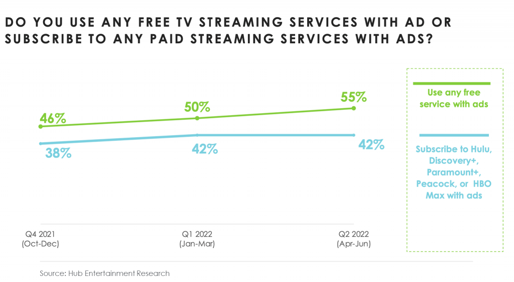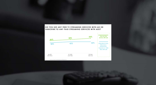A new survey of over 3,000 consumers conducted by Hub Entertainment Research found that the percentage of US TV viewers who watch free, ad-supported streaming services (FAST) like Roku Channel, Pluto TV or Freevee, increased to 55% in Q2 2022, up from 50% in Q1 2022. Reported viewership among those who watch partially ad-supported subscription services like Peacock, Hulu, or HBO Max remained flat at 42% when compared to Q1. (NextTV: 8/16/22)