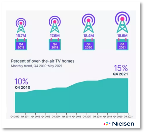 Nielsen’s latest Local Watch Report takes a close look at the increase in over-the-air TV households and their viewing behaviors. According to the analysis, titled “The Over-the-Air Evolution”, there are 18.6 million households (15.3% US), up 1% from a year ago and up 11% from 20210. This growth is in direct contrast to “the share of homes with cable, satellite, or telco pay-TV services” which has shrunk. The report also breaks out viewership three ways: households with OTA but no SVOD, OTA with SVOD (but no vMVPD), and OTA with SVOD (and with vMVPD). (NextTV: 4/21/22)