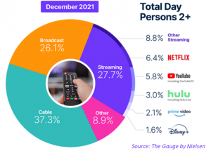 According to December 2021 research from The Gauge (Nielsen’s “monthly macro look at TV delivery platforms) total day broadcast viewership share has slipped to 26.1% behind streaming which stands at 27.7% (two months ago they were tied), while Cable is holding steady at 37.3%. The Gauge also looks at gaming along with other activities like “watching video discs” within the “Other” category. Up from 7% in November to 8.9% in December, this increase is the result of the “holiday videogaming season”. (SeekingAlpha: 1/16/22)