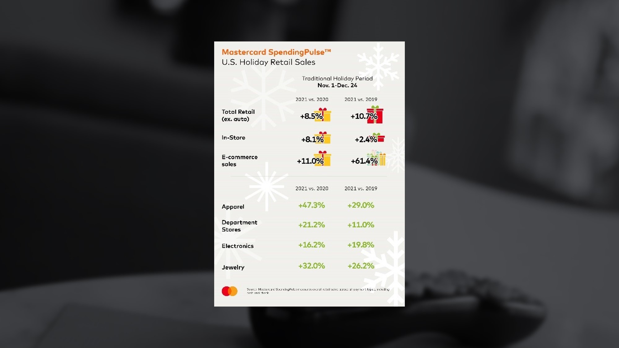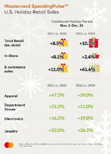 According to Mastercard Spending Pulse, holiday retail sales excluding automotive increased 8.5%, while online sales grew 11% compared to the same period last year. Supply chain and labor issues sent consumers online and in stores earlier this season; ahead of the “retail rush”. Apparel and department stores experienced strong growth as consumers returned to stores (+8.1% YOY). For the 75 days between October 11 and December 24 total sales were up +8.6% YOY as consumers shopped earlier than past years to secure “guaranteed by Christmas” shipping offers. Thanksgiving weekend also remained key as shoppers drove U.S. retail sales up +14.1% YOY between Friday, November 26 through Sunday, November 28. In-store sales increased +16.5 YOY while e-commerce sales experienced sustained growth, up +4.9% YOY. (Mastercard: 12/26/21)