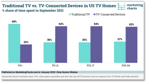 A Q4 2021 survey by Hub Entertainment Research found that 18% of US Households used at least one free ad-supported TV service (FAST); more than twice the penetration of Q4 2020 of 8%. Further, the FAST services were also seen to be the fastest-growing tier; increasing by 4.9 percentage points from the previous quarter. Among the FAST networks, Peacock, IMDB TV, and the Roku Channel account for 79% of new FAST users during the quarter. The desire for a broad range of original, quality content is out-performing people who are signing up to watch specific shows. Overall FAST networks saw increases in satisfaction scores and were the only tier with an improvement in their Net Promoter Score (NPS). (MediaPost: 2/4/22)