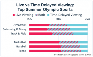 These findings are consistent with the recent Broadbeam Streaming Sports Study from Broadbeam Media (Active’s Data and Analytics arm) which surveyed sports viewers of the Olympics, NFL, NBA, and NHL.  The report forecast live viewership to be down, but “impressive numbers around attention paid to Olympic coverage”. Another expectation: time-delayed or highlight viewership will continue in Beijing as popular sports like skiing and snowboarding “lend themselves to highlight reels” similar to Summer Olympics sports like gymnastics, swimming/diving, and track & field. Conversely, Americans tend to prefer watching sports like Basketball, Baseball live. (Sports Business Journal: 2/2/22)