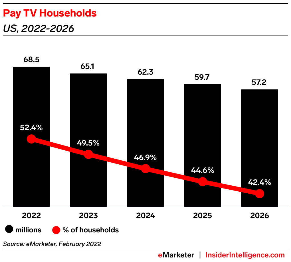 As more households cut the cable cord, emarketer forecasts that fewer than 50% of them will have a traditional pay TV subscription by the end of next year. The anticipated drop, from 68.5 million to 65.1 million households represents a 4.8% decrease. This decline comes after the loss of 50 million pay TV homes between 2016 and 2021, with the steepest drop in 2020 at 7.7%. Beyond the chart, look for the continued rise of vMVPD, as more cord-cutting households will turn to such services as Hulu + Live TV and YouTube TV. By the end of 2022, 15.0 million households will subscribe to a vMVPD, up 7.6% from 2021 and representing 11.4% of all US households.(eMarketer: 3/15/22)