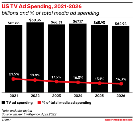 “As viewers migrate to digital video, so will ad dollars.” eMarketer suggests that US spending on linear TV ads has hit its peak this year, reaching $68.35 billion, and is predicted to “not surpass $68 billion again for the next four years.” US households are making the switch to using digital video which has significantly impacted the US ad market. It’s estimated that US video ad spending will exceed TV ad spending “by about $8 billion and making up 22.0% of the overall ad market.” (eMarketer: 4/12/22)
