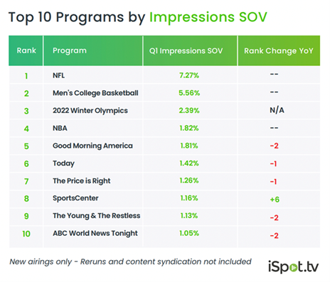 New insights from iSpot found that live sports accounted for over 20% of first quarter “TV ad impressions on new-airing programming”, thanks to the NFL, NCAA Basketball, and the Winter Olympics. Theatrical releases are up over 100% over Q1 2021, and travel is making a comeback, rising 157% YOY. In addition to tent-pole and sports (SportsCenter) programming, news (Good Morning America, The Today Show, and ABC World News Tonight) and daytime (The Young & The Restless and The Price is Right) rounded out the top ten programs with “new airings”.  And while overall quarterly TV ad impressions were up 9% (YOY), spending was up nearly 37% from the tent-pole activity. (TVRev: 4/19/22, iSpot: 4/15/22)