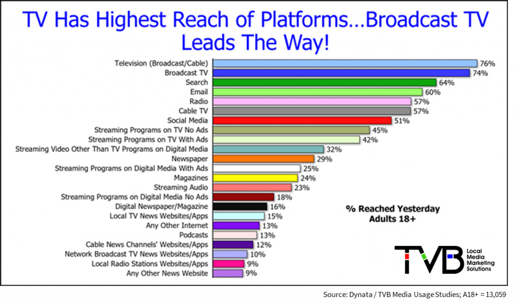A media usage study in battleground states conducted by Dynata for the TVB “found that TV has the largest reach (76%), with broadcast leading the way at 74%. The report looked at individual states, party affiliation, and key demographics (A18-34, A35+, men, women, African Americans, and Hispanics). In each case, TV led with the highest reach. The study also found that TV is #1 “for motivating viewers to get out and vote” with 74% in agreement. For “Trust in News”, Local Broadcast TV led with 79% in agreement. (TVTech: 5/4/22)