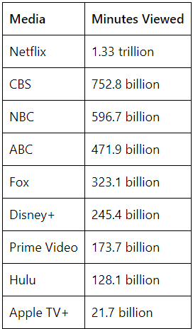 Nielsen’s tracking of the big four broadcasters (ABC, NBC, CBS, and FOX) and five streaming services (Apple TV+, Disney+, Hulu, Netflix, and Prime Video) for the season to date (9/20/21 – 5/8/22) “accounted for more than 4 trillion minutes of viewing time — or 203 hours for all 332 million people in the United States. This figure doesn’t include some broadcasters (CW, Univision and Telemundo), some streamers (e.g. YouTube), and cable (which Nielsen estimates at around 38% of TV usage) so the total “is likely north of 6 trillion minutes … or 301 hours” per person in the US. (THR: 5/13/22)