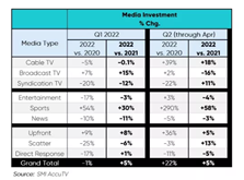 Standard Media Index (SMI) reports that April spending for national linear TV increased 5% vs. a year ago; following a flat month in March. Among the top five media companies, Warner Bros. Discovery, boosted by the NCAA tournament, received the largest revenue share; up 40% to 28%. And while Fox saw a slight gain (up 3%), the balance, Comcast (-2%), Paramount (-17%), and Disney (-7%), saw declines. SMI also looked at spending by category (entertainment, sports, news) and by type (upfront, scatter, DR) for April and Q1. (NextTV: 5/31/22)